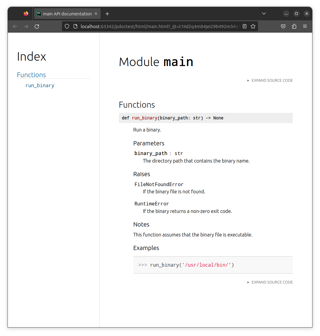 Once installed, you can generate HTML documentation for your Python code using the pdoc