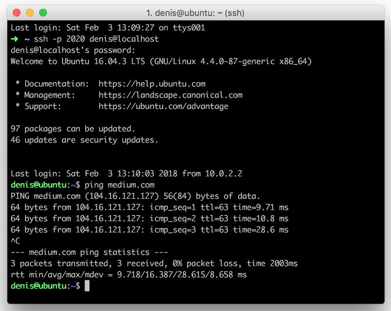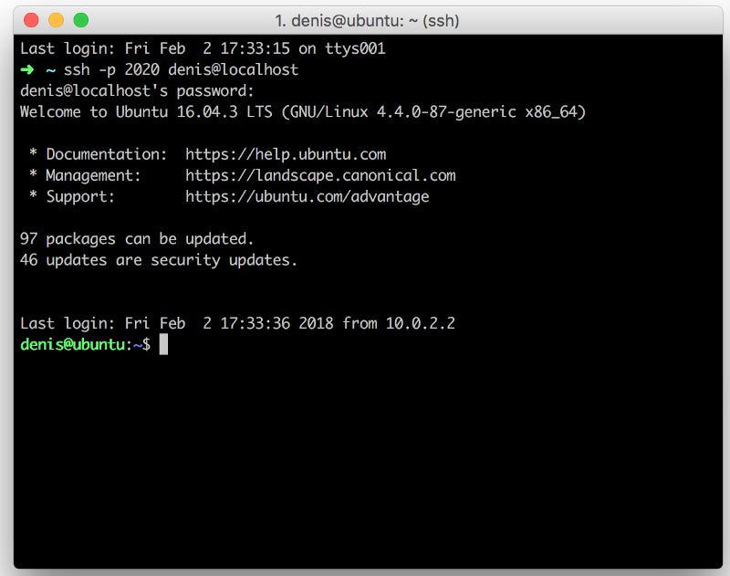 If you have enabled port forwarding, you can now SSH into your virtual machine from your Host machine as in the figure below.