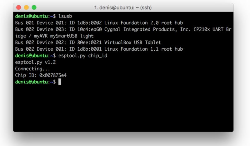 Plug your NodeMCU and run lsusb to verify that your device is connected. After that, run esptool.py chip_id. You should now see the board’s chip id.